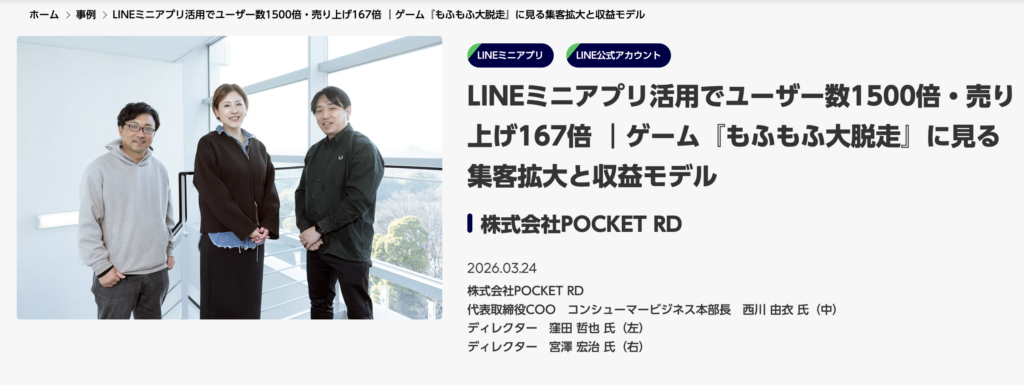 株式会社Pocket RDが提供するLINEミニアプリゲーム「もふもふ大脱走」は、ネイティブアプリからLINEミニアプリに移行し、ゲーム内課金(コンティニューやアイテム購入)を実装した結果、ユーザー数が1,500倍・売上が167倍という信じられない成果を叩き出しました。
