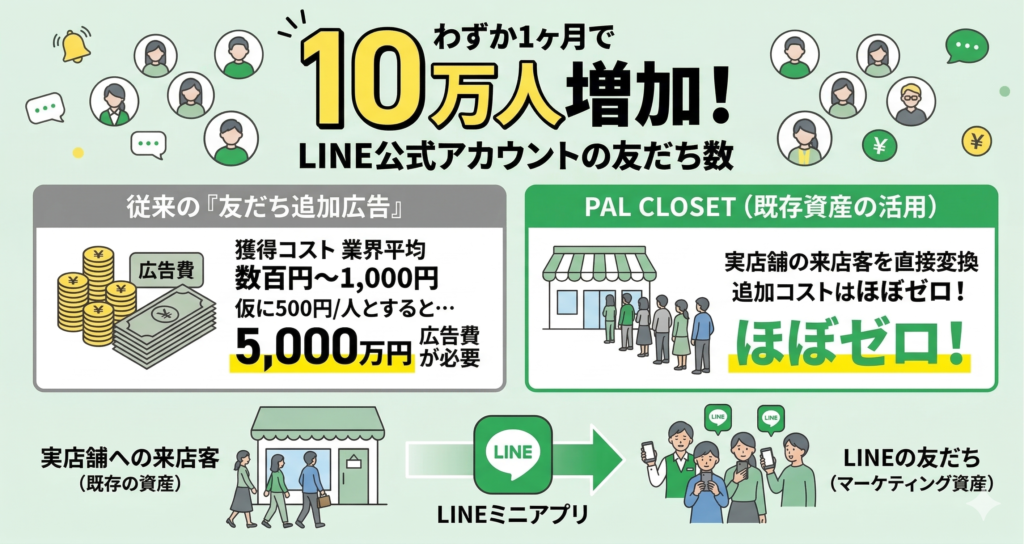 10万人という数字の凄さを実感するために、別の角度から考えてみましょう。LINE公式アカウントの友だち増加施策として一般的な「友だち追加広告」を使った場合、1人の友だちを獲得するコストは業界平均で数百円から1,000円程度かかると言われています。仮に1人あたり500円のコストだとすれば、10万人の獲得には5,000万円の広告費が必要な計算になります。