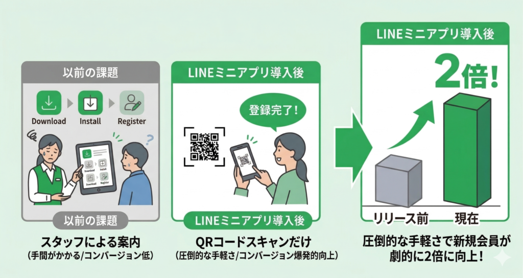 LINEミニアプリ導入直後の月、新規会員の獲得数がそれ以前と比較して実に2倍に跳ね上がりました。
